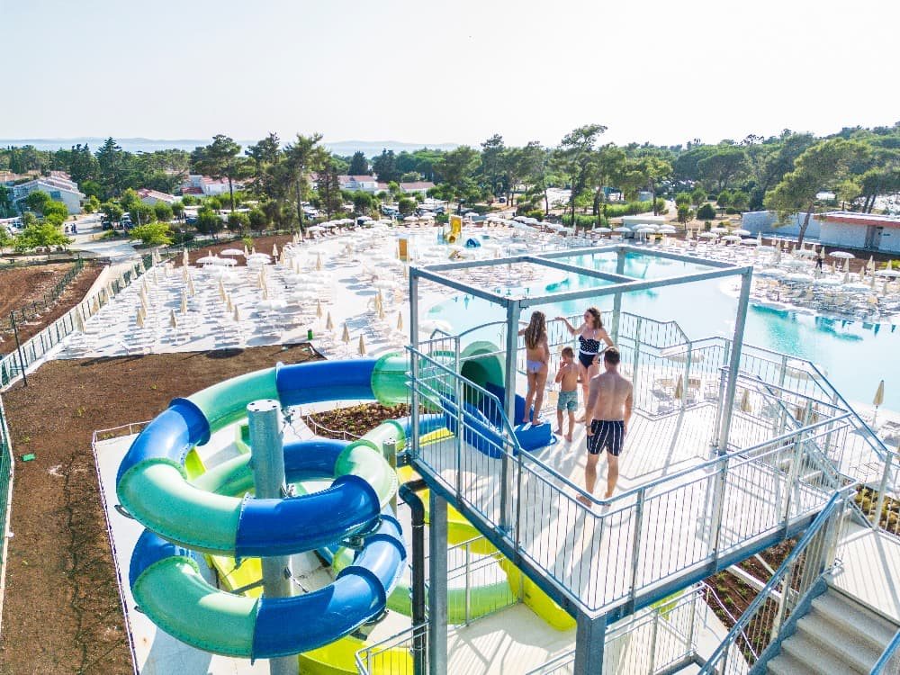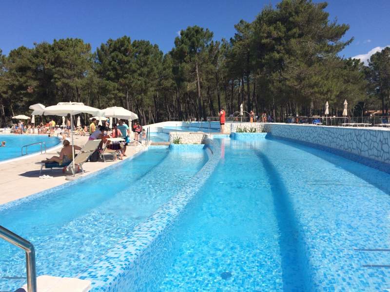 větší bazén s hydromasážními lavicemi a panoramatickým výhledem na Jadran, plocha 196 m² a hloubka 1,20 m, 2 propojené bazény o rozloze 236 m² a 77 m² určené pro mladší publikum, sprejový park o rozloze 304 m²