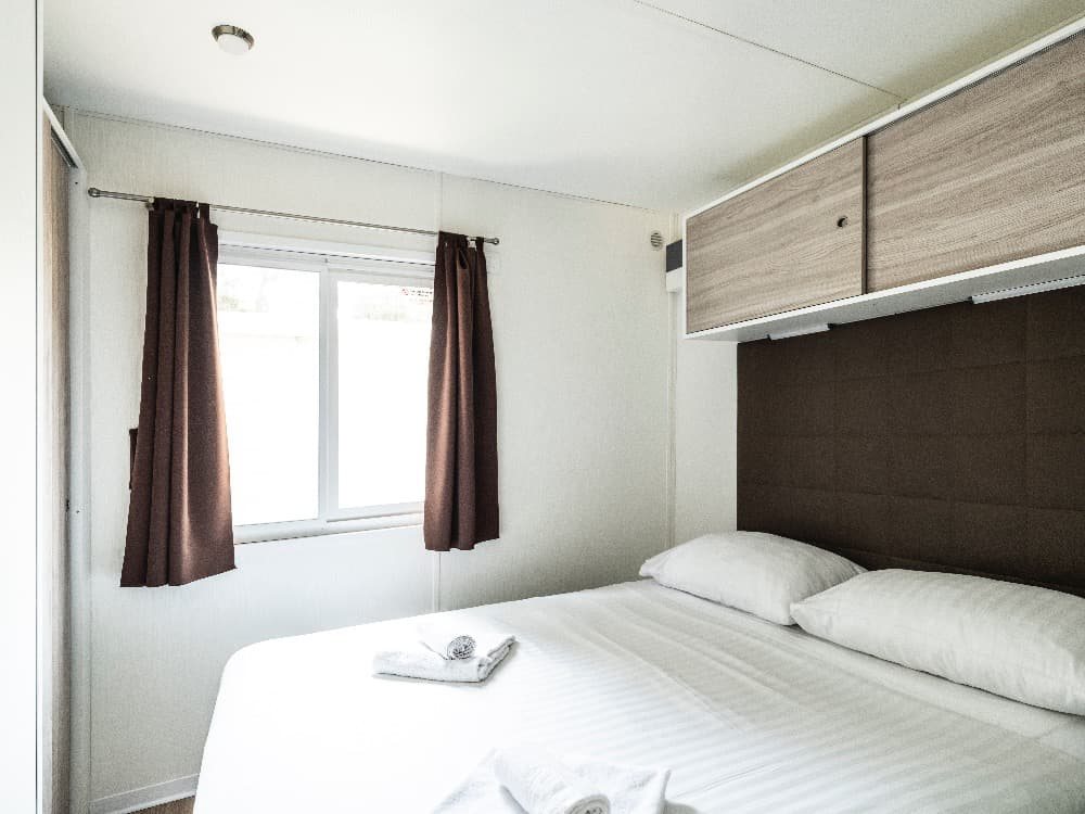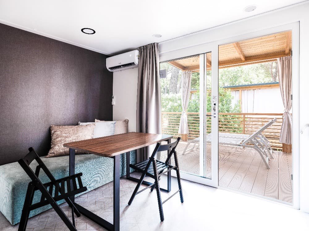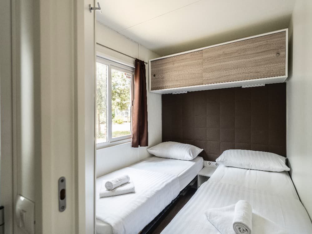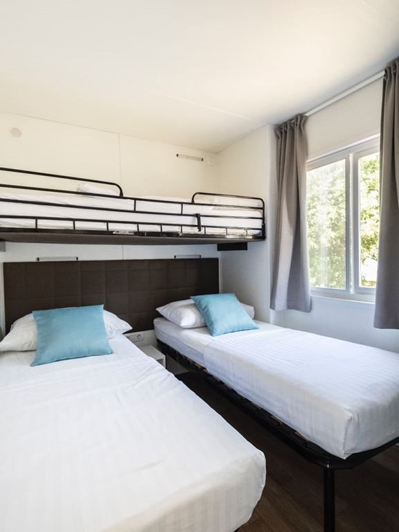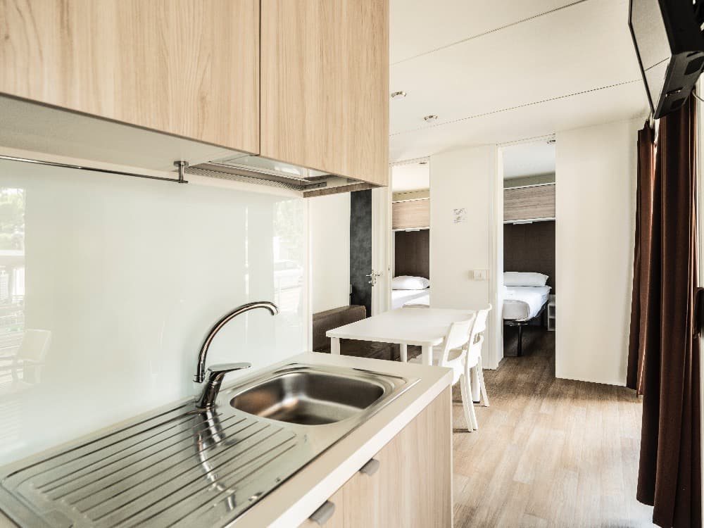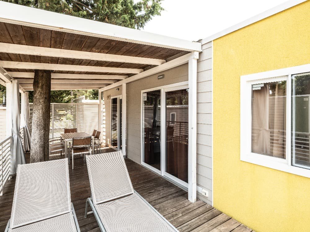 Superior Family 5+2: velikost mobilehomu 34,4 m 2 (několik typů mobilních domků), 1 ložnice (manželská postel), 1x ložnice (oddělená lůžka+postel v patře), jídelní kout s rozkládací sedačkou pro 2 osoby (lůžko 70 x 190 cm) v denní místnosti, kuchyňská linka pro vaření, plynový vařič se 4 hořáky, mikrovlnná trouba, kávovar, příbory a nože, lednička, SAT TV, klimatizace, 2x sprchový kout s WC, zastřešená terasa se zahradním nábytkem 25,8m 2 Mobilní domky jsou vzdálené cca 500 - 1000 od moře a pláže. K pláži jezdí v pravidelných intervalech zdarma vláček.