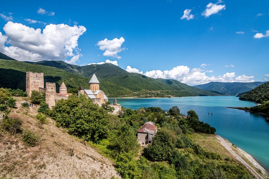 Prohlédneme si pevnostní areál, včetně kostela Panny Marie. Vyšlápneme si i na hradby a obranné věže s výhledem na hory a nádhernou přehradu Zhinvali . Kontrast modré vody a kamenné pevnosti vytváří jednu z nejkrásnějších scenérií v Gruzii.
