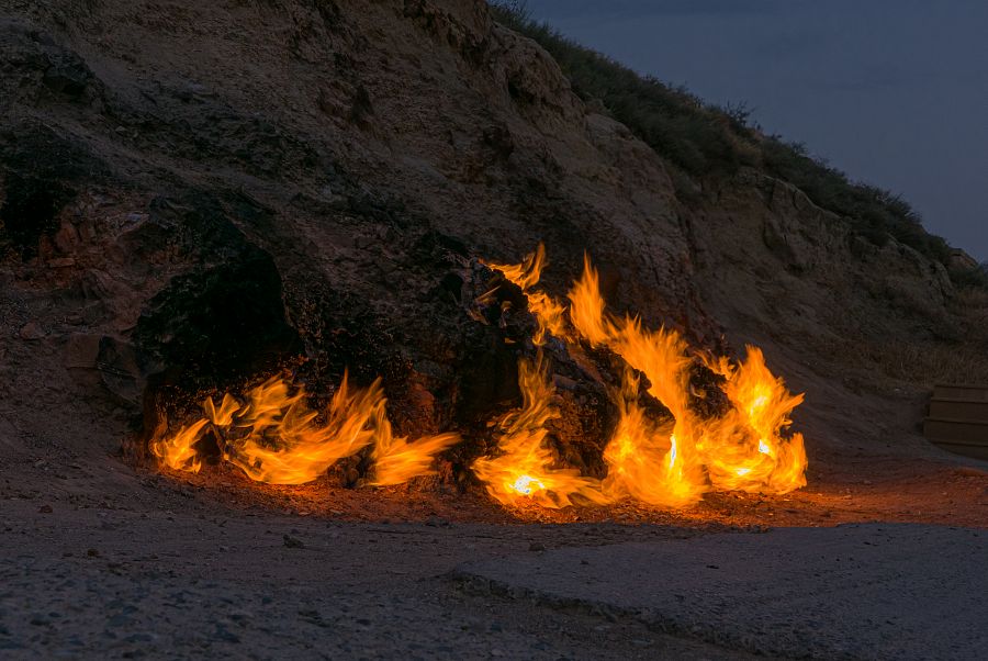 Dále navštívíme slavný Yanar Dag , což znamená v ázerbájdžánštině „Hořící hora“ , a to doslova. Jedná se o přírodní úkaz , kde ze země neustále šlehají plameny, které nikdy nezhasínají, bez ohledu na déšť nebo vítr. Jedná se o přírodní vývěr hořlavého plynu (zejména metanu), který uniká z podzemních vrstev. Plameny hoří nonstop po celý rok, ve dne i v noci.