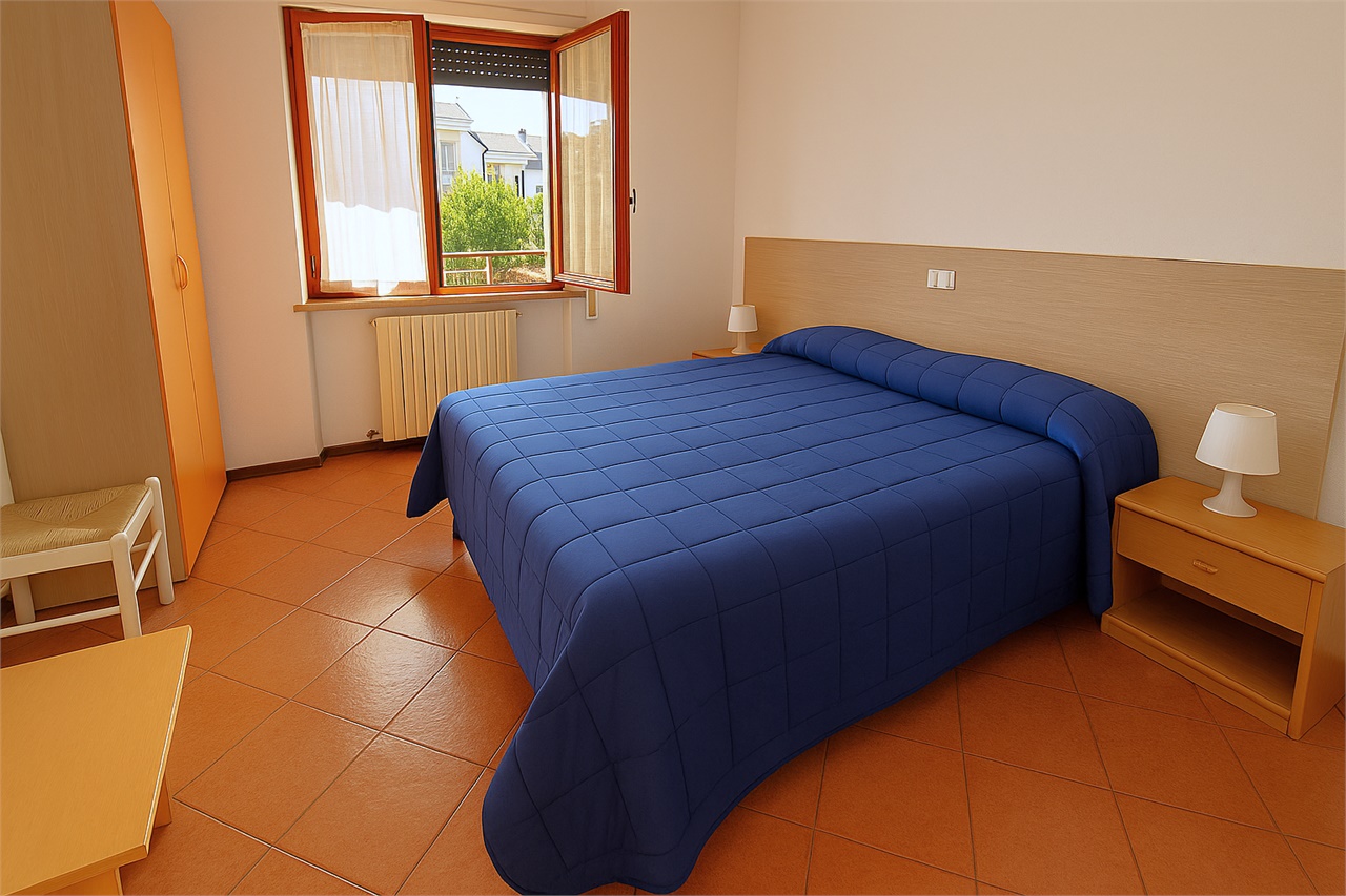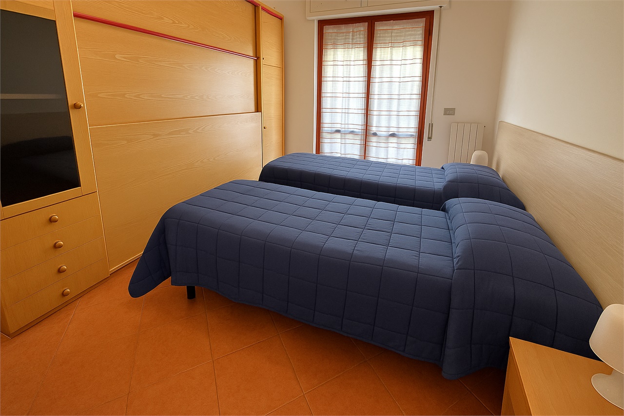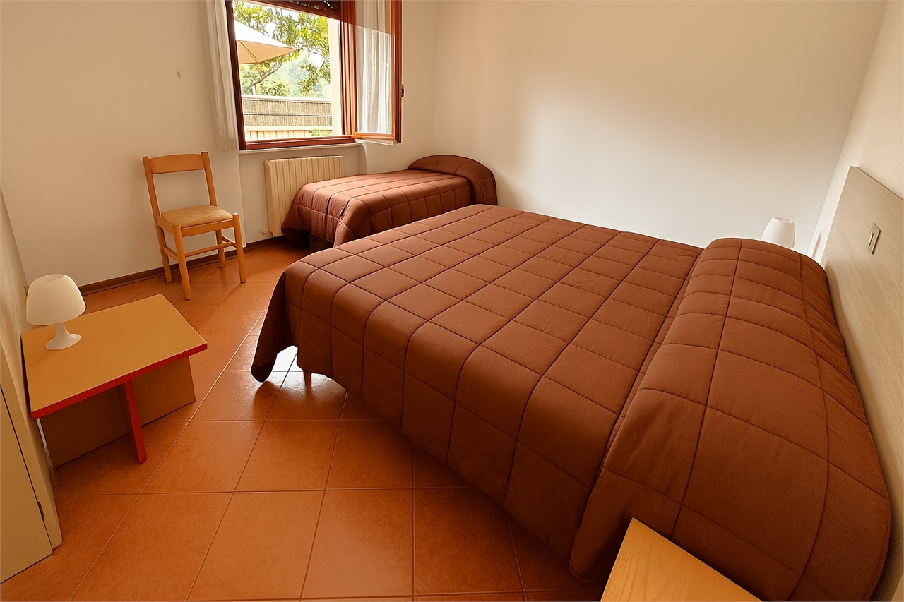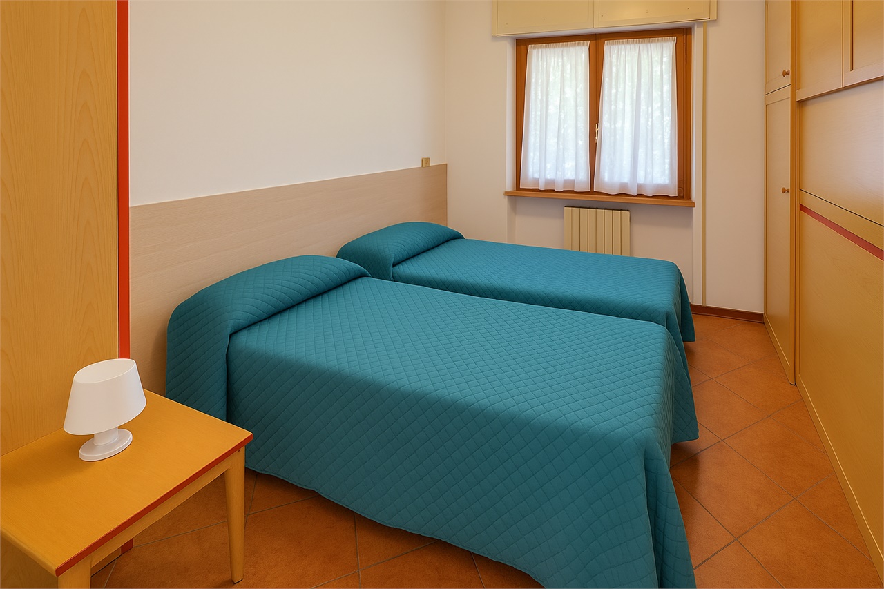 TRILO 5 (55 m²) - třípokojové apartmány pro 5 osob, 1 ložnice s manželskou postelí a samostatným lůžkem, 1 ložnice se dvěma samostatnými lůžky, jídelna s kuchyňským koutem, koupelna se sprchou a soukromá terasa/balkon