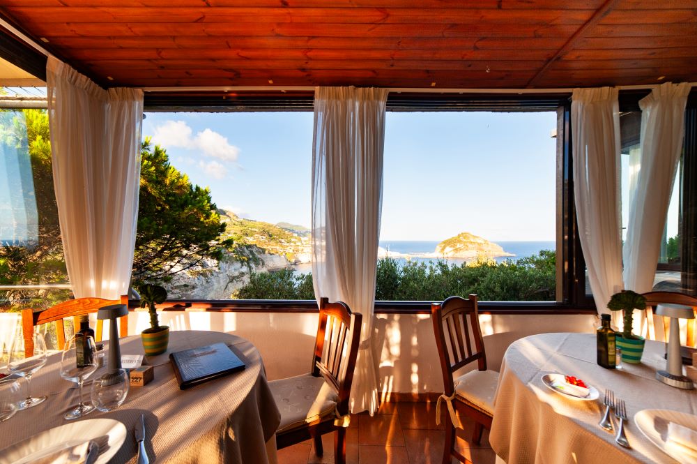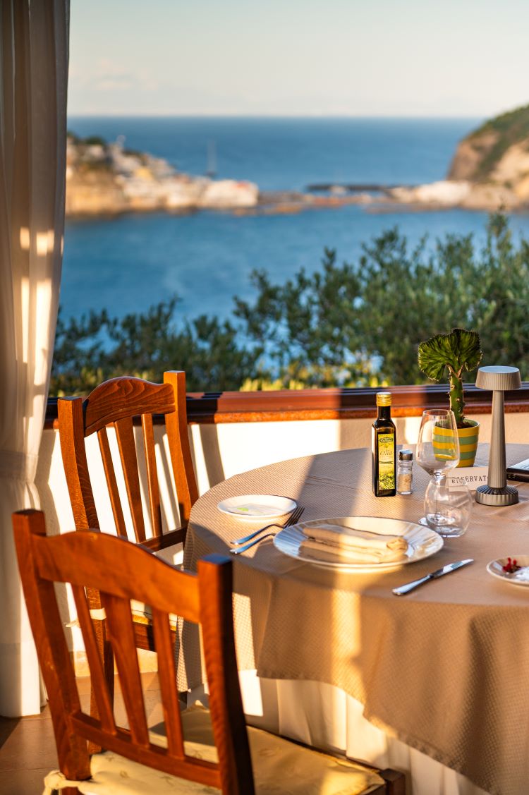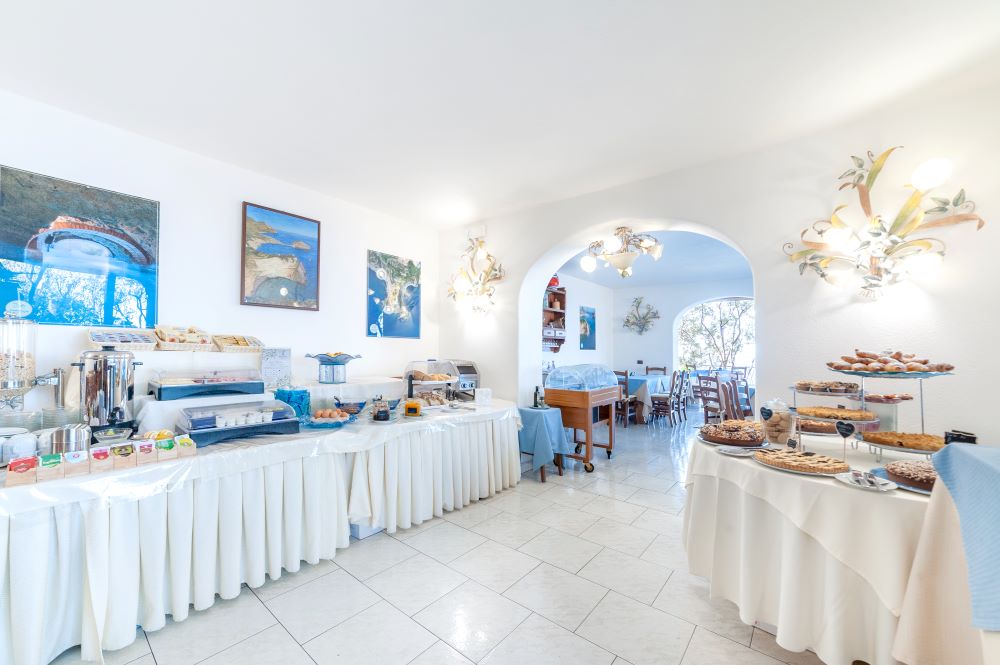 snídaně formou bufetu; oběd je možné objednat á la carte, hotel využívá z velké části vlastních produktů k přípravě pokrmů s ohledem na tradiční ischitánskou kuchyni, vlastní výroba marmelád, zavařenin, medu, olivového oleje, zelenina atd., pobyt s polopenzí na vyžádání