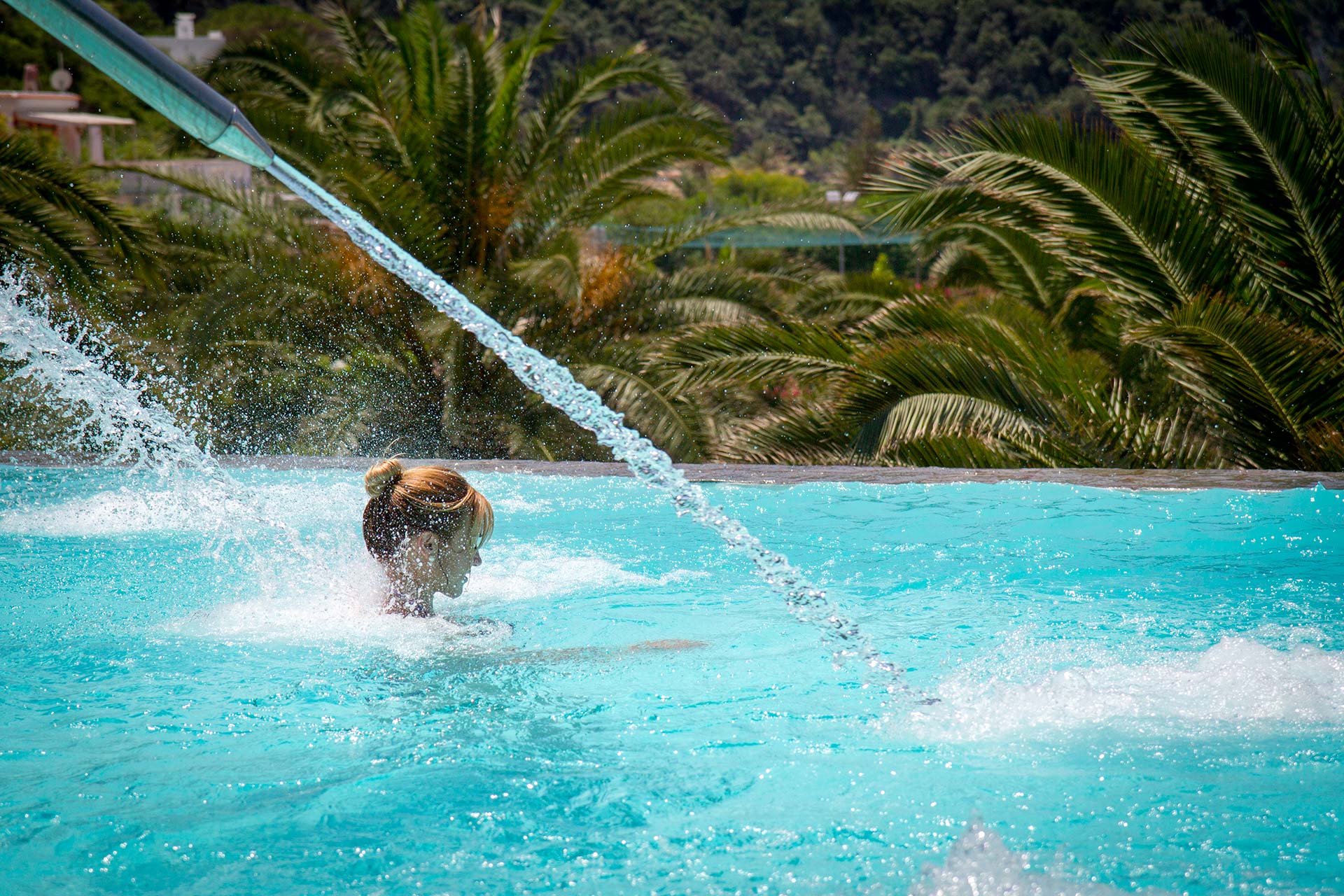 v centru rozlehlé zahrady plné ušlechtilých rostlin s desetiletými palmami, bugenvileami, agávemi a dalšími exotickými a středomořskými druhy, je velký venkovní termální bazén s teplotou 32-36.°C, vybaven lehátky a slunečníky, terasovitý park Semiramis s výhledem na moře (prostor vyhrazený pro dospělé), se 3 solnými bazény (systém elektrolýzy slané vody), k dispozici od května do října, wellness centrum a centrum krásy za poplatek – široká nabídka masáží a lázeňských procedur, WI-FI v celém hotelu zdarma, parkování zdarma, během dne obsluha baru u bazénu