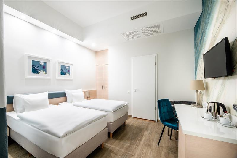 2 lůžkové pokoje mají koupelnu s WC, kabelovou TV, fén, klimatizaci, trezorek a varné konvice.