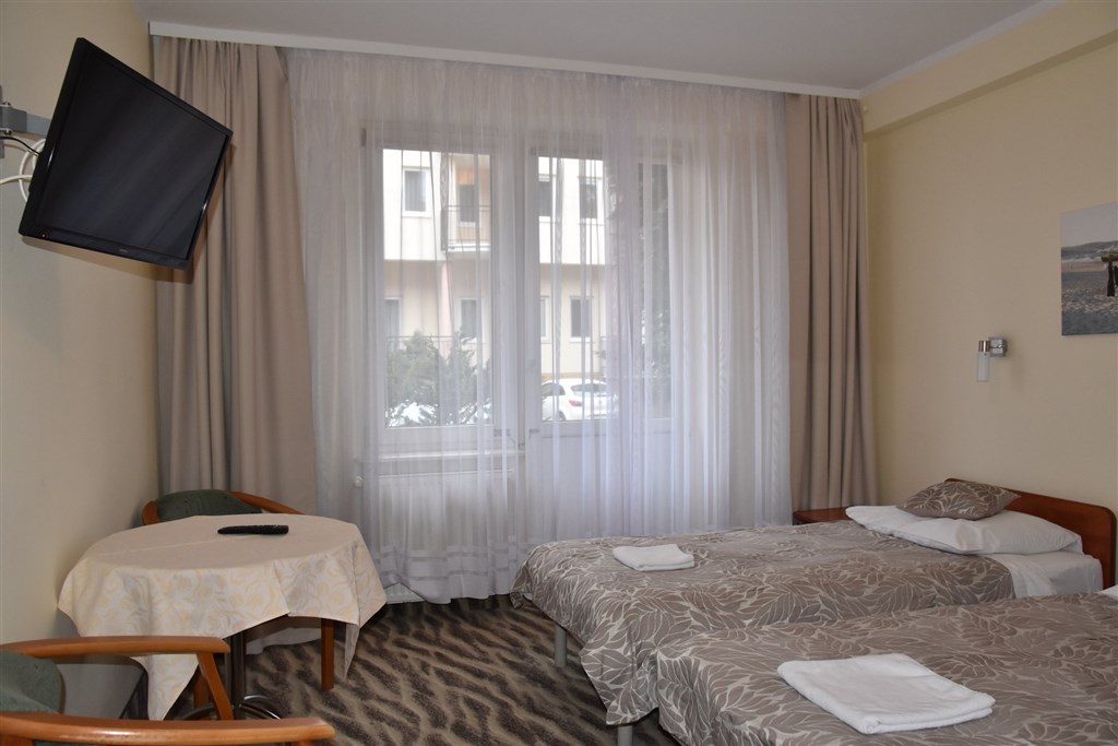 • Dvoulůžkový pokoj s možností 1 přistýlky, pracovní stůl, šatní skříň, koupelna s WC, lednice, TV, Wifi, balkon nebo terasa. Část pokojů bez balkonu.