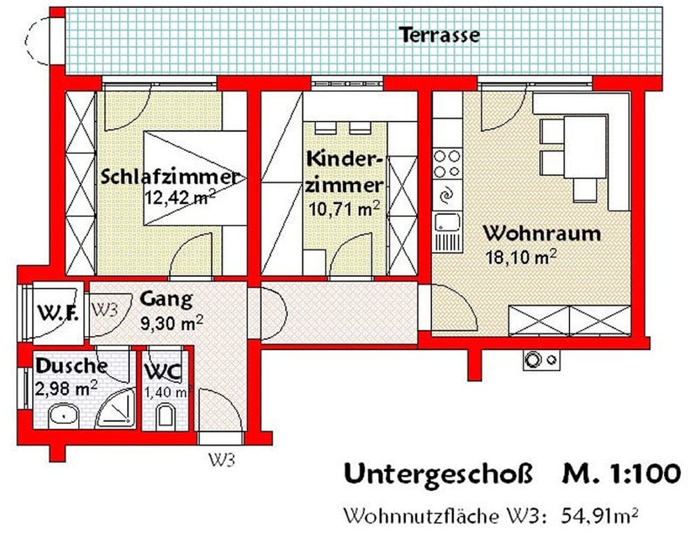 Apartmán pro 4-6 osob (cca 55 m2): 2 oddělené ložnice, terasa, vybavená kuchyň vč. kávovaru, el. sporáku s troubou, apod., jídelní kout, koupelna se sprchou, oddělené WC, SAT-TV a předsíň.
