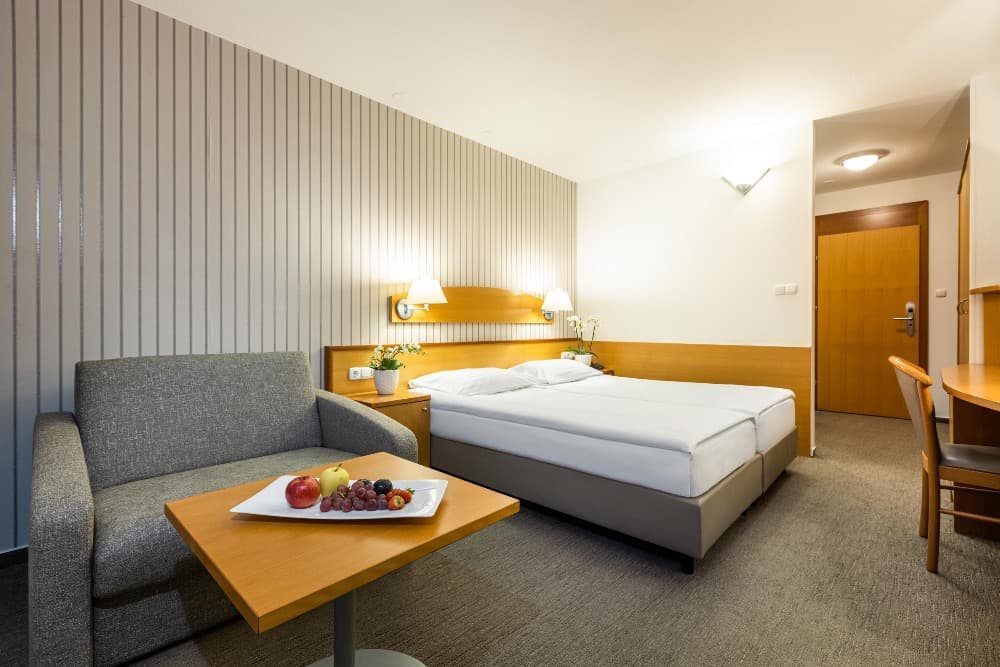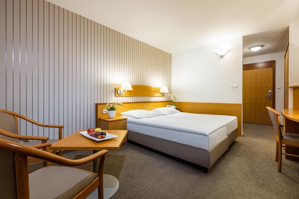 Ubytování: dvoulůžkový pokoj ECONOMY bez možnosti přistýlky, francouzské lůžko šíře 140 cm, velikost pokoje 18 m 2 , koupelna, WC, telefon, fén, klimatizace, televize, výhled do parku. Dvoulůžkový pokoj STANDARD s možností 1 přistýlky, má francouzské lůžko šíře 180 cm nebo 2 x lůžko šíře 90 cm, velikost pokoje 20 m2, koupelna, WC, telefon, fén, klimatizace, televize, výhled do parku. Dvoulůžkový pokoj STANDARD S BALKONEM s možností 1 přistýlky, velikost pokoje 20 m2, koupelna, WC, telefon, fén, klimatizace, televize, balkon, výhled do parku.
