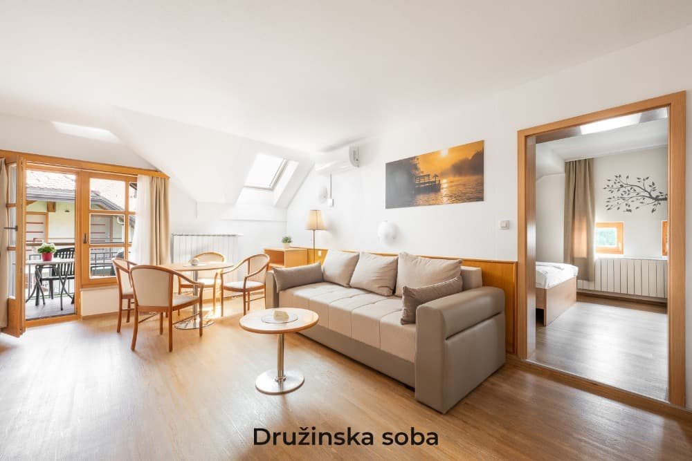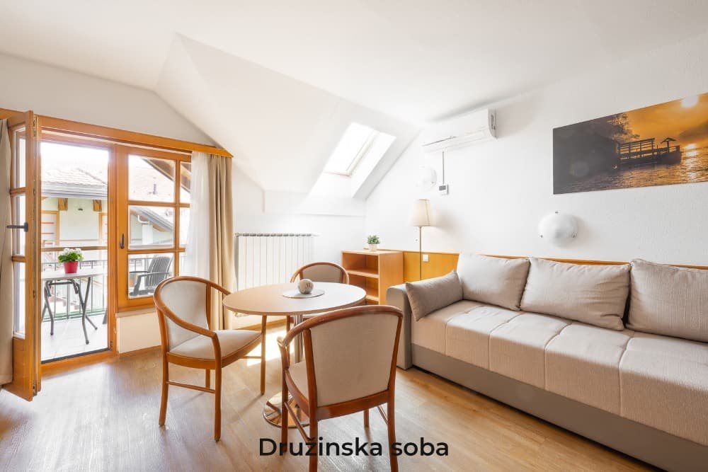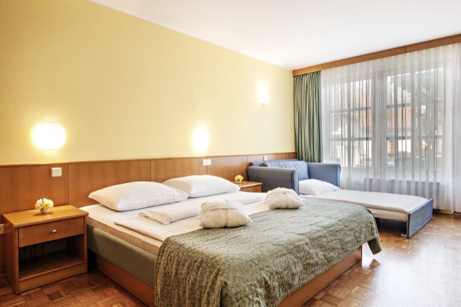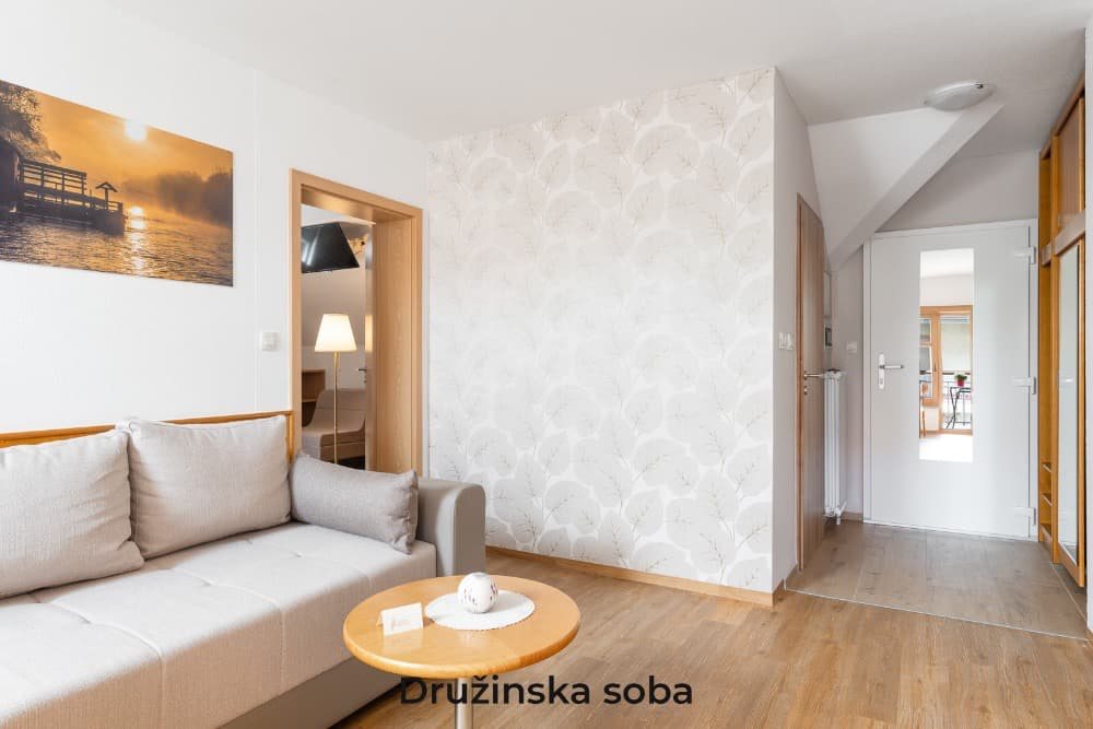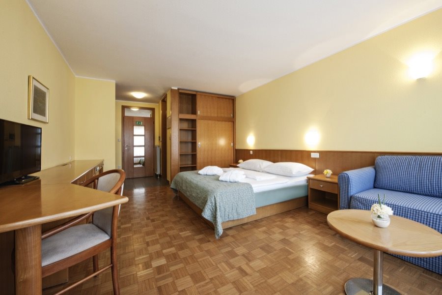 Rodinný pokoj pro 4 osoby má plochu 60 m 2 , jedná se o 1 ložnici a rozkládací pohovku v denní místnosti.