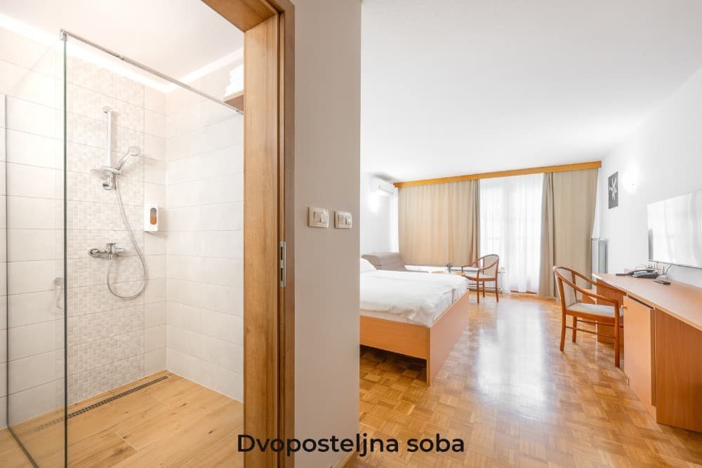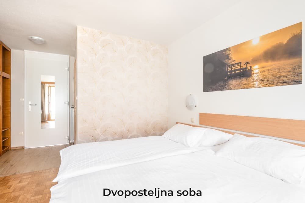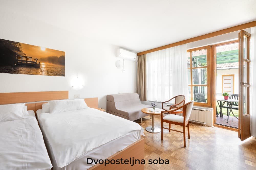 Dvoulůžkový pokoj s možností 1 přistýlky, pokoj má plochu cca 27 m 2 , koupelnu, WC, francouzské lůžko o šíři 160 cm a balkon s pohledem do parku.