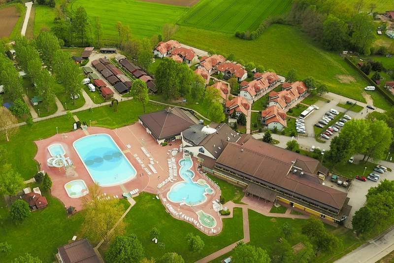 Hosté hotelové vesnice mohou využívat 6 bazénů v hotelu Zeleni gaj: vnitřní termální bazén (33-35 °C), venkovní termální rekreační bazén (25-30 °C), venkovní termální bazén (34-35 °C), venkovní dětský bazén (hloubka 30 cm, 25-30 °C), venkovní bazén se dvěma tobogány (25-30 °C), venkovní bazén s přírodní vodou (36-38 °C). K dispozici jsou také dva samostatné nudistické bazény. Vnitřní a venkovní termální bazén jsou otevřeny od 8:00 do 21:00, všechny ostatní bazény jsou otevřeny od 8:00 do 20:00. Pravidelně je k dispozici noční koupání. Vnitřní a venkovní termální bazén a venkovní bazén s přírodní vodou jsou otevřeny celoročně.