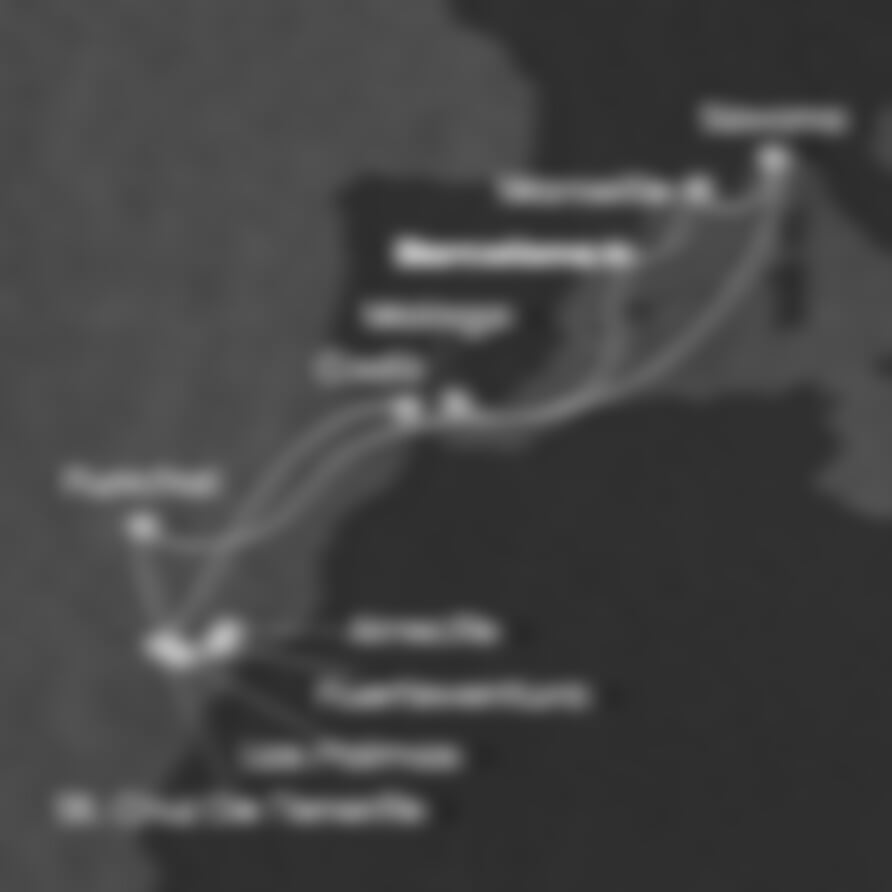 Barcelona (Španělsko) - Marseille (Francie) - Savona (Itálie) - Malaga (Španělsko) - Funchal (Portugalsko) - Fuerteventura (Španělsko) - Arrecife (Španělsko) - Las Palmas (Španělsko) - St. Cruz de Tenerife (Španělsko) - Cadiz (Španělsko) - Barcelona (Španělsko).