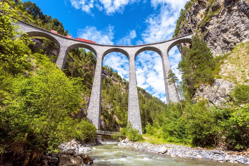 3. den: : Cyklotrasa Davos - Landwasserviadukt - Filisur - Tiefencastel - Soliser Viadukt (40 km, ↑ 600 m, ↓ 1200 m). Etapa vede po úbočích i dnem údolí řeky Landwasser a vede k legendárnímu železničnímu mostu. Poté se trasa napojí na stezku údolím řeky Albula a končí u fotogenického mostu Solis. LANDWASSERVIADUKT - monumentální kamenný železniční viadukt překlenující řeku Landwasser, který je 136 metrů dlouhý a 65 metrů vysoký. FILISUR - malebná vesnice v údolí Albuly. TIEFENCASTEL - město je od středověku důležitým bodem na obchodní cestě přes průsmyk Julier do Engadinu. SOLISER VIADUKT - nejvyšší viadukt Rhétské dráhy, který je 89 metrů vysoký a 42 metrů dlouhý. Přemosťuje řeky Albulu, která pod mostem vytváří dramatickou soutěsku. Po návratu do Davosu možnost výjezdu lanovkou do hor nebo projížďky na kole po okolí města.