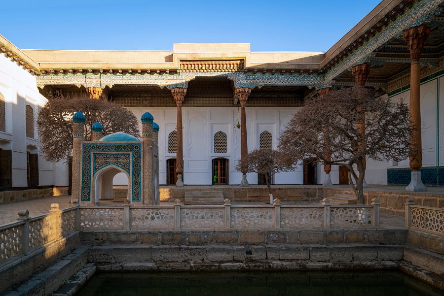 Pak navštívíme madrasu Muhammada Aminhana z 19. století s unikátním modrým minaretem , která je největší v celé centrální Asii. Samotný minaret se měl stát největším na světě, projekt ovšem nebyl nikdy dokončen.